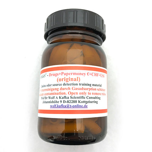 SOKKS-MPTS® Drugs plus Paper Money follows the same principle as the explosives system, with one exception. Whilst target odor is presented in its pure form, this system combines several odors in one training aid. Extensive research has shown that training the dog on all target odours each time is beneficial to the overall ability of the dog. This “combined” method of training has become the standard of all police, military stations and airports in Austria.