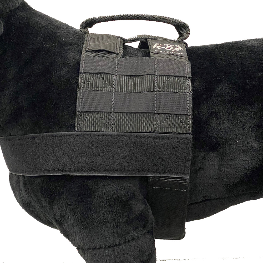 This harness was designed for the Specialized Search Dogs (S.S.D.) Program. It has webbing on both sides of the harness to allow you to attach any type of MOLLE Pouch or Radio Pouch. There is a Velcro area that will accomodate three 2" x 8" removable I.D. Panels. It is made with 2" Mil-Spec Nylon and features a cop-lock quick release buckle and buit in handle on top.. Underbelly strap is adjustable.
