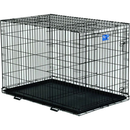 Whether starting with a new puppy or starting again with an adult dog, this Single Door Folding metal dog crate cuts housebreaking time in half and reduces behavioral problems. The exceptionally versatile unit features a divider panel that allows for adjusting the length of the living area. Keeping the living space small enough reduces the chance of the puppy eliminating in one end and sleeping in the other. Choose the size of crate that the dog will need when it reaches its full adult size, as the divider can be adjusted as the puppy grows. Other highlights include safe and secure slide-bolt latches, a durable satin-black electro-coat finish, 1-1/2-by-5-7/8-inch mesh, rounded corners, and two plastic handles for carrying. The unit easily sets up and folds down to a portable size for suitcase-style carrying, and an ABS-composite plastic pan for easy clean up comes included.